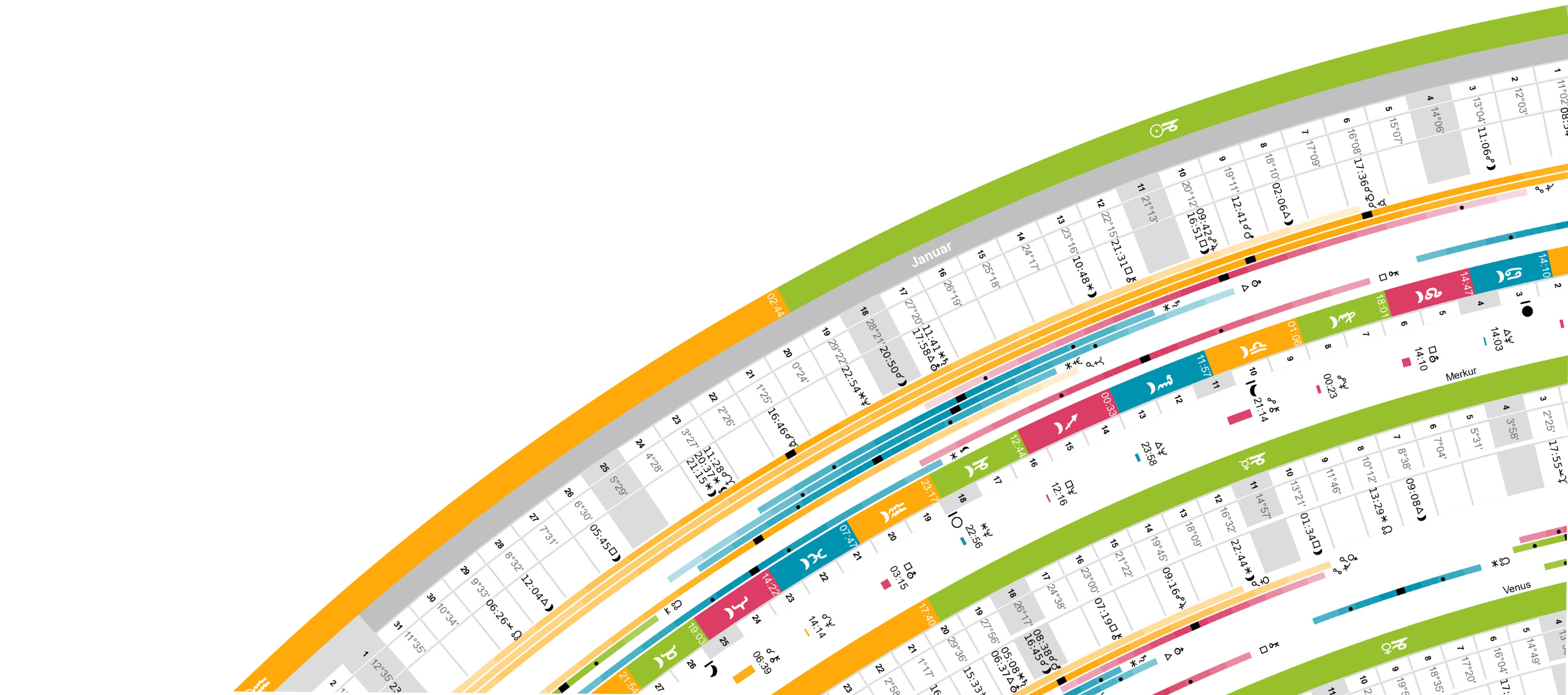 Alle Orben werden einzeln angezeigt. Auch die Rückläufigkeit, Leerlauf und die Aspktirung werden angezeigt.Die Dynamik und Entwicklung ist durch die kreisförmige Anordnung der 365 Tage schnell zu erkennen. Das Poster zeigt alle Ereignisse und Positionen der zehn Planeten als auch Mondknoten, Lilith und Chiron fürs Kalenderjahr 2026. Die Dynamik und Entwicklung ist durch die kreisförmige Anordnung der 365 Tage schnell zu erkennen. Als Blickfang ist er ideal fürs Foyer oder Sitzungszimmer