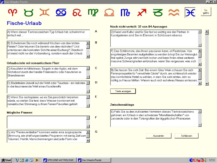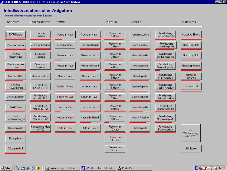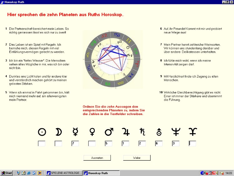 80 Übungsspiele mit mehr als 1000 Fragen zu Tierkreiszeichen, Häusern, Planeten, Aspekten und Horoskopen.